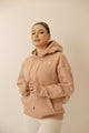 Crafted from a premium blend of 42% cotton / 52% polyester / 5% other fibers, the fabric combines breathability with plush warmth, creating the perfect balance between softness and durability. The oversized fit, spacious hood, and front pocket make it ideal for studio warm-ups, travel days, or everyday comfort.
